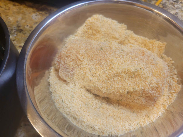 1. Slice the Chicken Breasts in half, width-side. See the picture for an example. Then use a meat tenderizer to pound them thin. This should only take a few minutes because you already made them pretty thin.