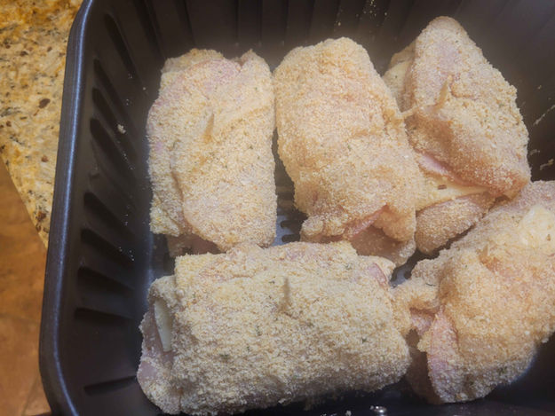 5. Roll each rolled piece of chicken in the Butter, then roll it in the Ritz Cracker mixture until it is completely coated. Place it in the Air Fryer. Click here for the Air Fryer that I use and love!