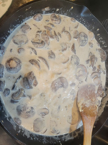 3. In the same pan that you used to cook the bacon, leave about 1 Tbl. Bacon Grease (just for flavor). Turn the heat onto medium and melt the Butter. Then add the Minced Garlic and the Mushrooms and sauté them until they are tender and fragrant.