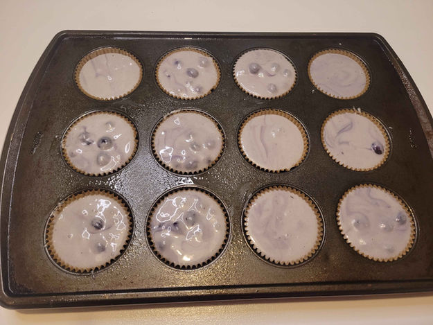 5. Fill the muffin cups with the batter. I like to use a 1/3 cup measuring cup to fill them. It is less messy that way. Fill them until they are almost full.