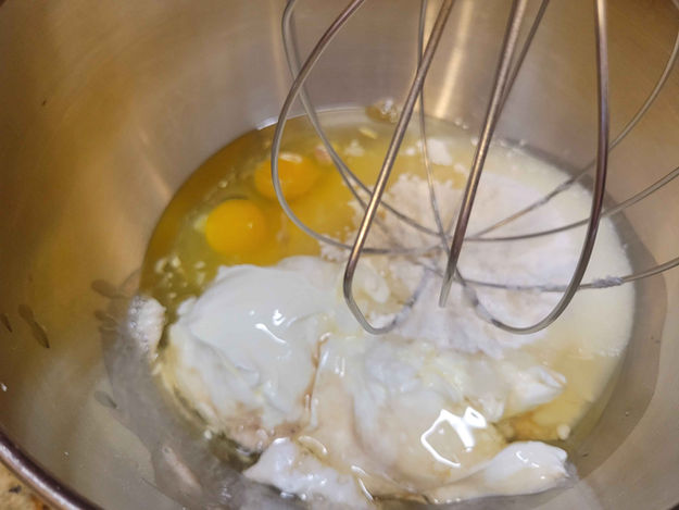2. In a mixing bowl combine the Flour, Sugar, Baking Powder, Baking Soda, Salt, Eggs, Sour Cream, Oil, and the Vanilla. Mix it until it is mixed well.