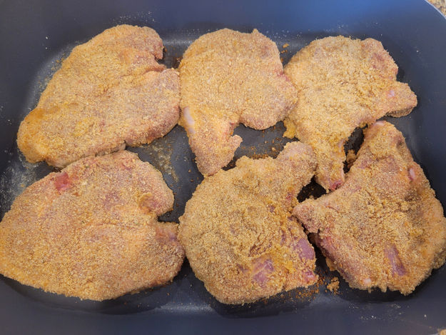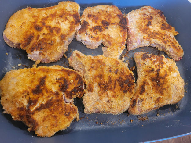 3. Heat a large frying pan or cast-iron skillet on a medium heat. Melt the Butter in the bottom of the pan. Then dip the Pork Chops in the Eggs, then dip them in the Bread Crumbs until they are coated on both sides. Then place them in the frying pan and cook them till they are golden brown on each side. Place them on a baking sheet.