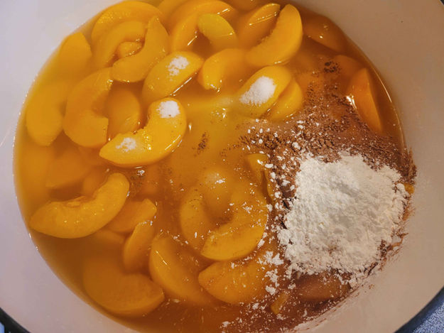 2. In a large pan add the Peaches with the Juice. Add the Sugar, Cinnamon, and the Cornstarch. Turn the heat onto medium and cook it, stirring constantly, until the juice thickens to a gravy-like consistency.
