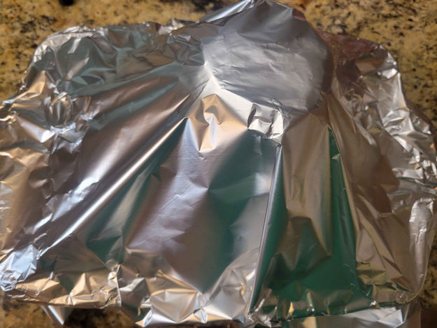 2. Place the ham fat side up in a 9x13 baking dish. Cover the ham with aluminum foil and bake it for 10 minutes per pound.