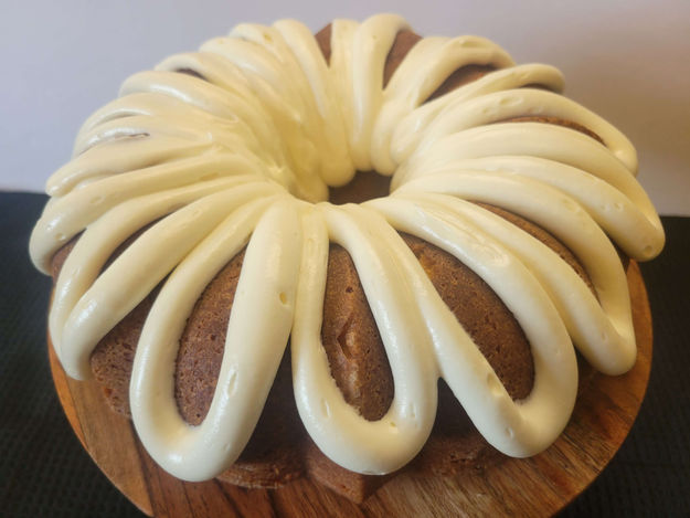7. In a medium-sized mixing bowl add the Butter, Cream Cheese, Milk, Vanilla, and the Powdered Sugar. Mix it until it is smooth and creamy. Pipe the icing over the cooled cake.