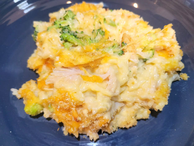 6. Stir the Rice, Broccoli, Chicken, and the Sauce together and put it in a 9x13 glass baking dish.