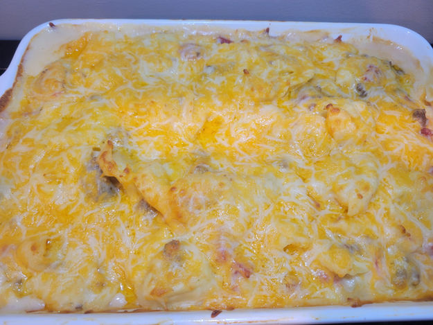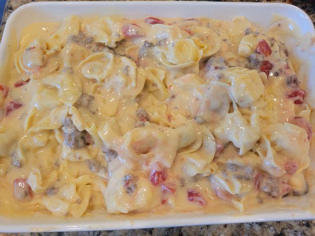 6. Combine the Tortellini, Tomatoes, Sausage, and the Cheese Sauce. Stir together until it is mixed evenly. Then pour into a 9x13 glass baking dish. Top with Cheese.