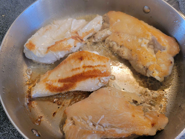 2. While you are waiting for the water to boil, in a frying pan, place a Tablespoon of butter in the bottom of the pan. Fry the chicken on both sides until it is cooked through. You can use a little salt and pepper on the chicken to season it. When it is cooked through, remove the chicken, chop it in bite-size pieces and place it in a container to keep it warm. If you grill the chicken, then cut it in strips so that it grills quickly and grill it on low, turning it over until it is cooked through.