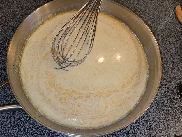 3. In the same frying pan, melt 1 cube ofButter. I like to let the butter cook for a couple minutes until it starts to brown. This gives your alfredo sauce a little color and it gives it more flavor.