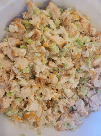 2. Dice the Chicken, Onion, and the Celery and place it in a medium-sized mixing bowl. Add the Cashews and the Mayonnaise and stir it until it is all mixed together.