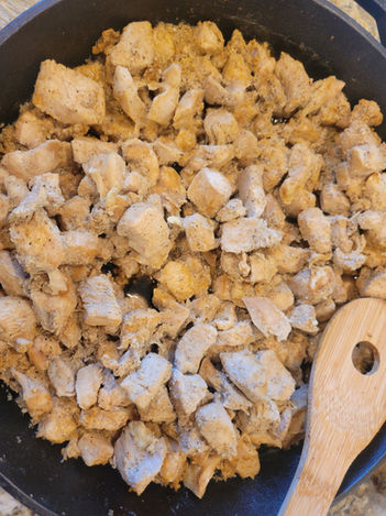 2. While the rice is cooking, cut the Chicken into bite-sized pieces. Heat a pan on a medium heat and add the Olive Oil. Then cook the Chicken until it is cooked through. Add the Chipotle Powder, Salt, and the Garlic Powder. Stir together and let it simmer on a low heat for 3-4 minutes.
