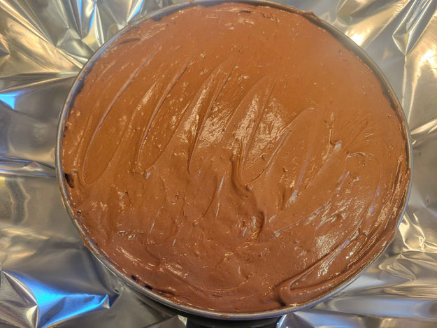 10. Place the Springform Pan in aluminum foil and then place it in a larger pan that has about an inch of water in it. I have tried making cheesecakes without the hot water bath and the cheesecake will often crack. I have never had a cheesecake crack on top when cooking it in a hot water bath. Trust me on this one. It is annoying, but it works.