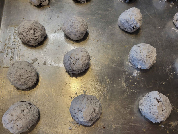7. Grease the baking sheet and roll the cookie dough into 1-1/2-inch balls, depending on the size of cookie you want. Roll each ball of dough in powdered sugar and place it on the baking sheet. Repeat for each cookie.
