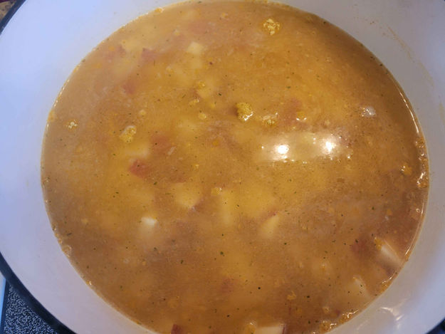 2. In a large soup pot combine the Potatoes, Water, and the Knorr Chicken Bullion. Turn the heat on high. When it starts to boil add the Frozen Corn. Cook the Corn and Potatoes for 10 minutes, or until they are mostly tender.