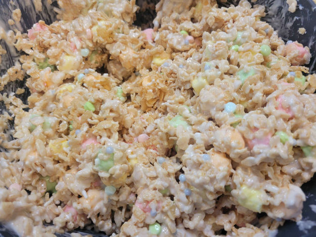 2. In a large mixing bowl combine the Rice Krispies, Colored Marshmallows, and the Sprinkles (if you want to add them). Stir to combine.