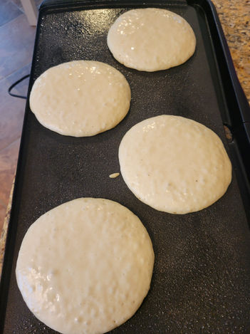 3. Heat a griddle or a frying pan. I heat my griddle to 350° F, or a frying pan to medium. You don’t need to grease a griddle, but depending on the kind of frying pan you have, you may need to grease it so the pancakes don’t stick. Pour about 1/3 c. of batter on your heated pan.