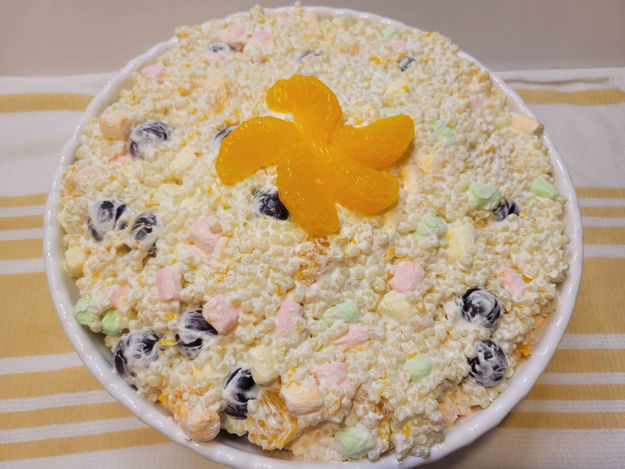 4. Drain the Mandarin Oranges and the Pineapple. Add them to the salad. Add the Grapes and the Marshmallows.