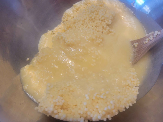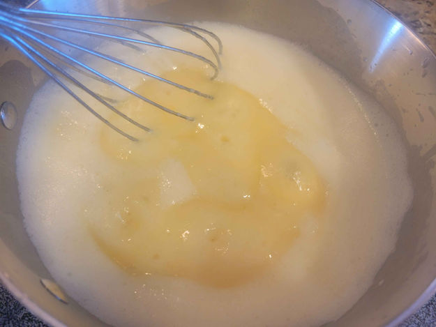 2. In a sauce pan combine the Sugar, Pineapple Juice, Lemon Juice, Egg, and the Salt. Stir it until it is smooth, then whisk in the Flour. Cook I on a medium heat until it has thickened into a sauce consistency. Then add the Butter and stir it in.