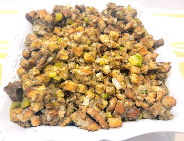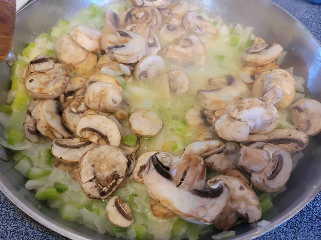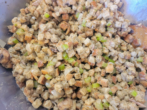 3. Chop the Onion and the Celery into small pieces. Melt the Butter in a frying pan and sauté them until they are starting to soften. Then add the Mushrooms and sauté them for another 3 minutes. When the vegetables are done cooking, add them to the Bread Cubes. Make sure that you add any remaining butter in the pan as well.