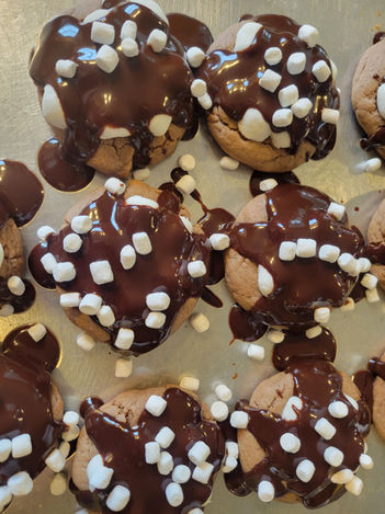 6. Grease a baking sheet and roll the dough into 1 ½ inch balls. Place them on the baking sheet. Bake them for 8 minutes. Then remove them from the oven and place 6 Mini Marshmallows on the top of each cookie. Then put them back in the oven for 2 more minutes. Remove them from the oven and let them cool on the pan for 5 minutes. Then move them to a cooling rack.