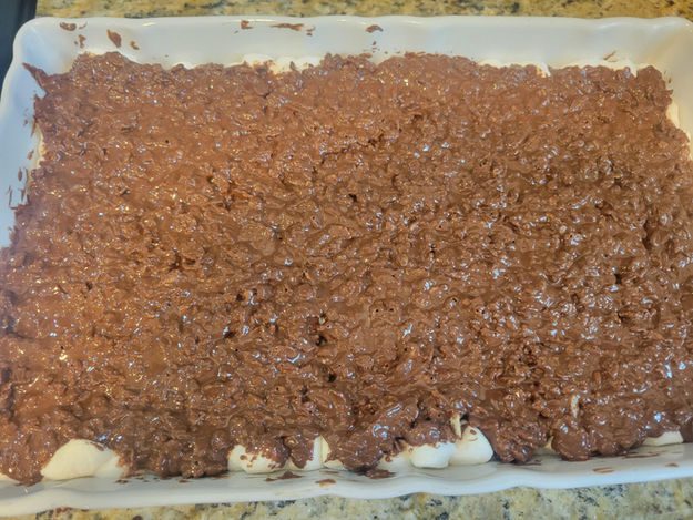 6. Make the topping. In a sauce pan melt the Chocolate Chips. Stir in the Peanut Butter, Butter. Add the Rice Krispies and stir it until it is smooth and creamy. Spread it over the top of the Marshmallows.
