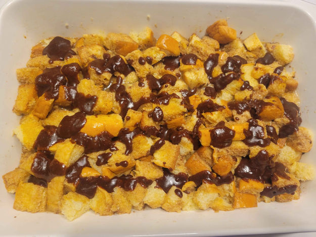 1. Grease a 9x13 glass baking dish. Cut the Bread into 1-inch cubes. Put all the bread into the baking dish.