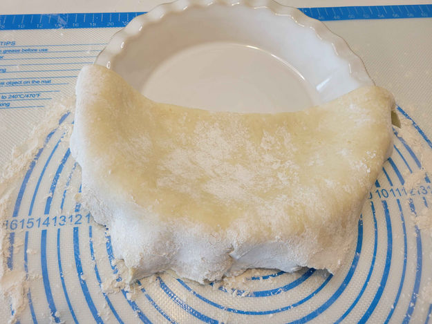 9. When the pie crust is rolled, fold it in half and place the pie dish right next to the folded pie crust. Carefully lift the pie crust into the pie dish. Unfold the crust and fit the crust snuggly around the pie dish.