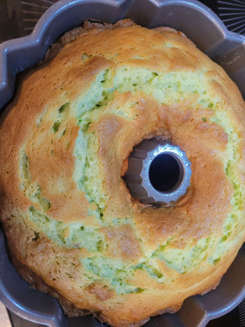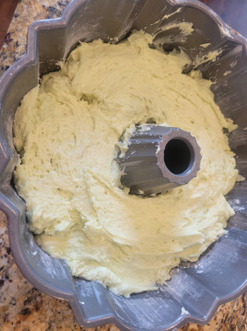 4. Grease and lightly flour the bundt pan. Pour the batter evenly in the pan and spread it out.