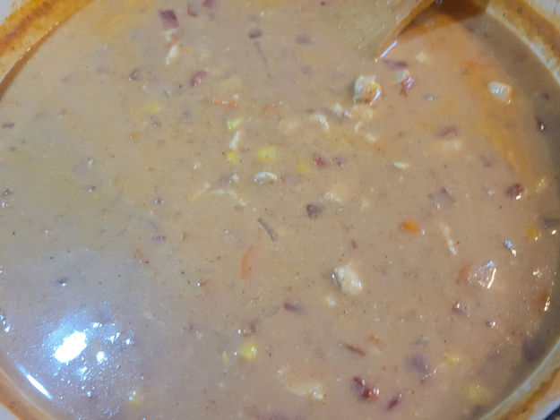 I love soup! I am always ready for soup weather so that I can make endless delicious recipes for dinner. I love it because it is tasty and makes me feel warm and cozy. This is a delicious soup recipe that resembles white chili, but without tons of beans. It is a creamy soup with tender veggies and chicken. It has tons of good flavor and is good with tortilla chips, sour cream, cheese, avocado or salsa. You can eat it with one or all of these sides. If you are not a huge bean lover, this is a good option for you. It has refried beans in the soup, but it actually helps it to be creamy. My family devours this soup whenever I make it. I always make sure I have plenty of tortilla chips on hand because they like to dip them in their soup. This recipe is simple to make and is a good, healthy option. I hope you love this recipe as much as we do!