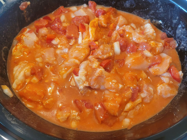 1. Dice the Chicken Breast, Onion, and the Red Pepper and place it in the slow cooker.