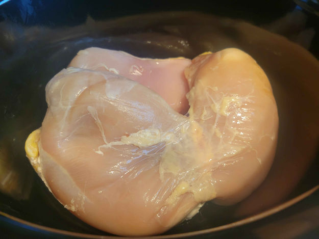1. Place the Chicken Breasts in a Crock Pot and turn it on low. Cook it for 5-6 hours. You can cook it faster if you turn it on high and cook it for 3-4 hours.