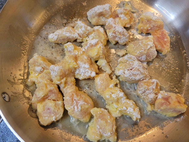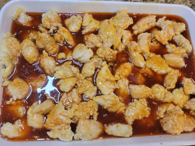 5. Place half the Chicken Pieces in the eggs. Coat the chicken, then add it to the cornstarch mixture. Coat the chicken completely in the cornstarch, then place it in the hot frying pan. Brown it, but don't cook it all the way through. Remove the chicken from the pan and place it in a 9x13 glass baking dish. Add the remaining Olive Oil and repeat for the remaining chicken.