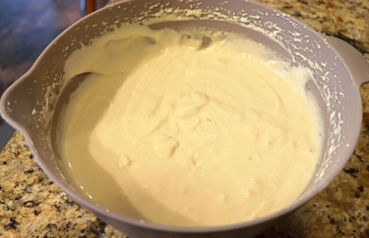 2. Put the Flour, Baking Powder, Salt, Sugar, Egg, Milk, and Oil into a mixing bowl. Mix this with a hand mixer until it is smooth.