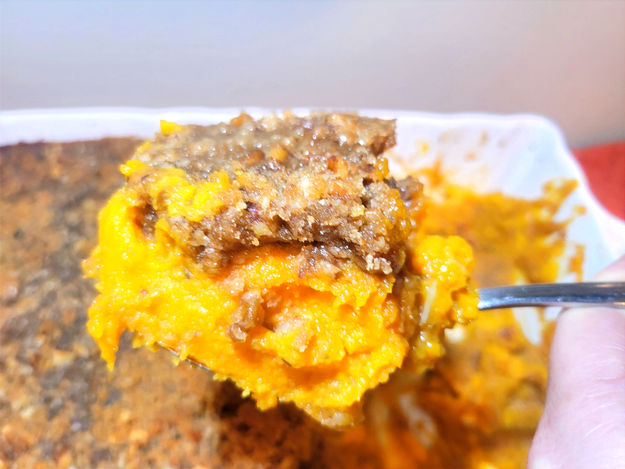 5. Pour the topping over the top of the sweet potatoes and spread it out evenly.