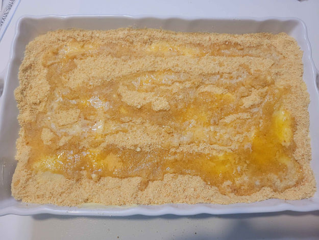 5. Crush the Ritz crackers. Add the Parmesan Cheese and the Garlic Salt. Mix together and sprinkle it on top.