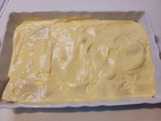 4. In a medium bowl mix the Cream of Chicken Soup, Sour Cream, Milk, Salt, and the Pepper. Mix together and pour evenly over the chicken.