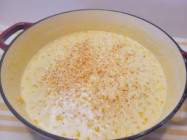 6. Add the Corn back into the Cream. Add the Sugar, Salt, and the Parmesan Cheese. Stir to mix together.