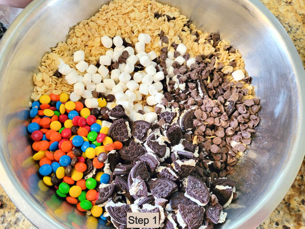 1. In a large mixing bowl combine Rice Krispies Cereal, 2 c. Mini Marshmallows, Chocolate Chips, M&M’s, and broken up Oreos.