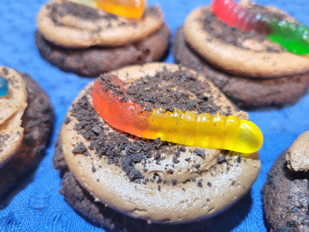 9. Frost the cookies and place a Gummy Worm on top. Sprinkle with the remaining Oreo crumbs.